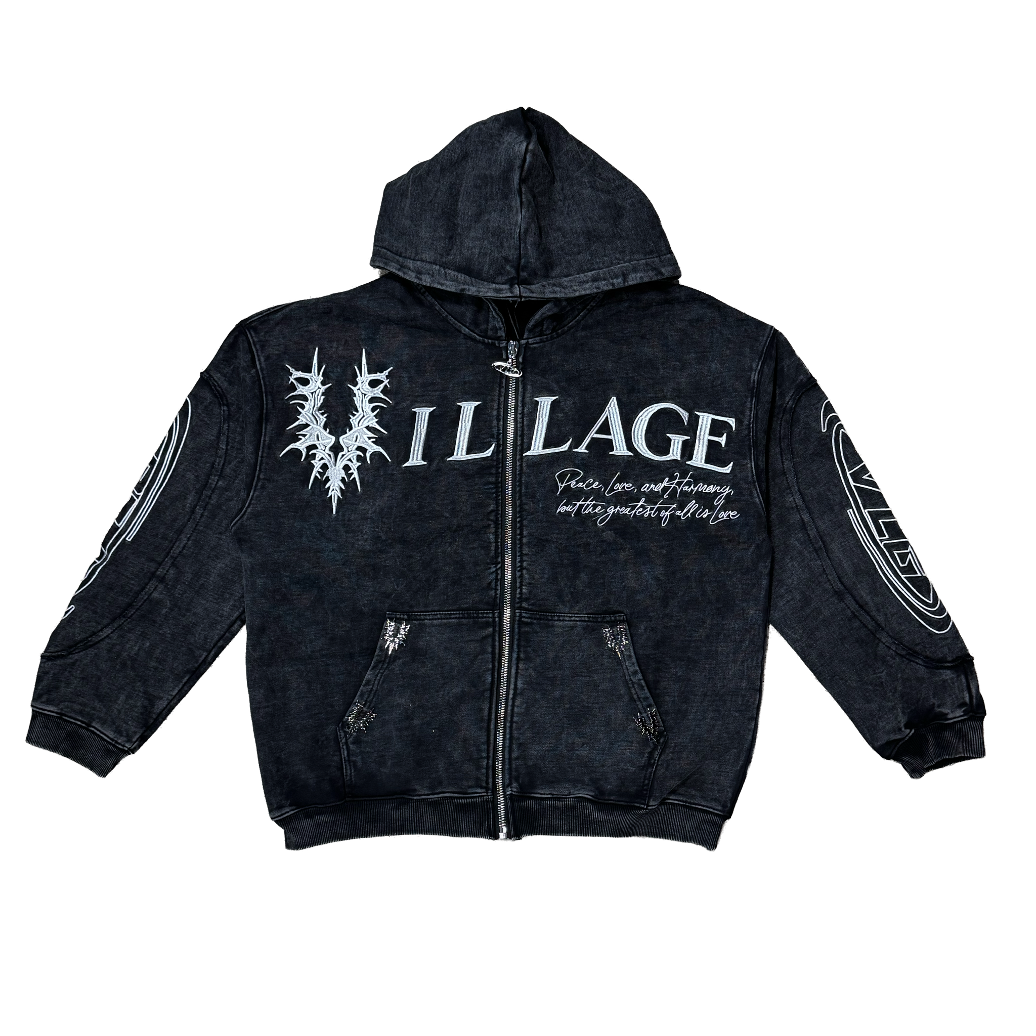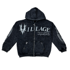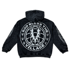 This Village zip-up hoodie features a dark washed finish with bold embroidered and printed graphics that give it a gritty, elevated streetwear look. The front showcases Village branding with sharp thorn-style detailing and script accents, while the sleeves add layered graphic hits for added depth. A full-zip closure, adjustable hood, and front pockets make this hoodie both functional and statement-driven. The back is finished with a large circular “God Bless The Village” graphic that ties the piece together with strong visual impact.