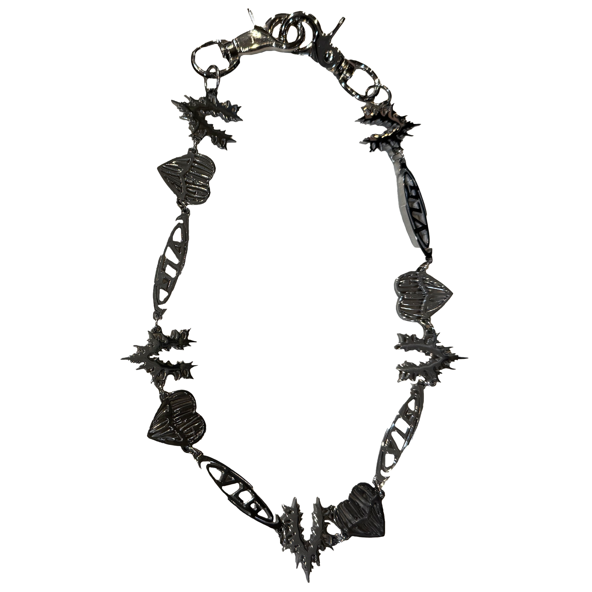 Vlg Core Logo Wallet Chain brings industrial polish to your fit with a high shine gunmetal finish and sculpted, custom links. Alternating VLG cutout logos, thorny spikes, and carved heart motifs create a bold, asymmetric run that catches light and attention. Dual oversized lobster clasps lock onto belt loops, wallets, or keys for secure everyday carry with a satisfyingly weighty feel. It drapes clean over denim or cargos and plays nicely layered with slimmer chains for extra texture. Unisex and built for daily rotation, it adds instant edge without trying. Pick up the Vlg Core Logo Wallet Chain at Future Rfrnce.